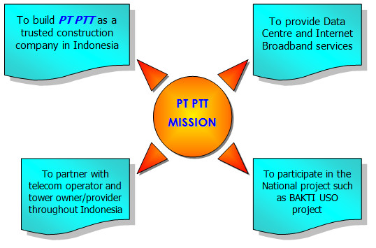 The Company's vision is to be a prominent provider for engineering services for IT and telecommunication sectors in Indonesia. In specific, PT PTT aims to lead in the provision of data centre, internet broadband and the infrastructure construction. The engineering services for telecommunication include SACME, Installation, Testing, Commissioning, Other Base Transceiver Station (BTS) and other supporting facilities. The infrastructure construction includes the building of road, bridge, housing, office, building, landscape and Interior Design works.